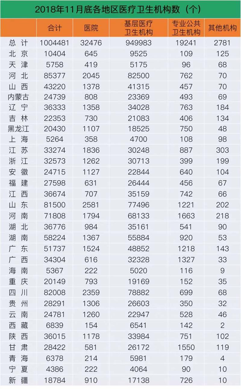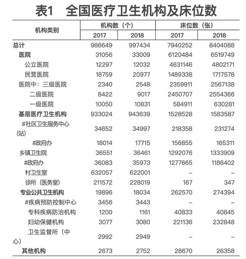 5月22日,國家衛(wèi)生健康委發(fā)布《2018年我國衛(wèi)生健康事業(yè)發(fā)展統(tǒng)計公報》(下稱《公報》)。數(shù)據(jù)顯示,2018年末,全國醫(yī)療衛(wèi)生機構(gòu)總數(shù)達(dá)997434個,其中醫(yī)院33009個。
