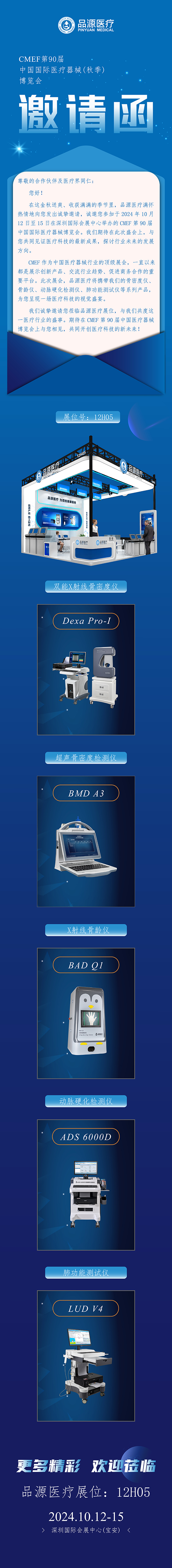 在這金秋送爽、收獲滿滿的季節(jié)里,品源醫(yī)療滿懷熱情地向您發(fā)出誠摯邀請(qǐng),誠邀您參加于2024年10月12 日至 15 日在深圳國際會(huì)展中心舉辦的 CMEF 第 90 屆中國國際醫(yī)療器械博覽會(huì)。我們期待在此次盛會(huì)上,與您共同見證醫(yī)療科技的最新成果,探討行業(yè)未來的發(fā)展方向。