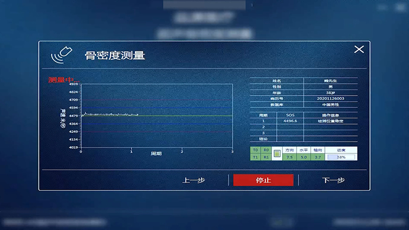 啟動測量:完成上述設(shè)置及“校驗(yàn)”后,點(diǎn)擊軟件界面上的“開始測量”按鈕。此時(shí),超聲骨密度儀開始發(fā)射超聲波,對受檢部位的骨骼進(jìn)行檢測。在測量過程中,要求受檢者保持靜止,同時(shí),操作人員需密切關(guān)注儀器屏幕上的數(shù)據(jù)采集進(jìn)度條,等待測量過程自動完成。通常,一次完整的測量過程可能需要數(shù)秒,具體時(shí)間取決于儀器型號和受檢者的個體差異。