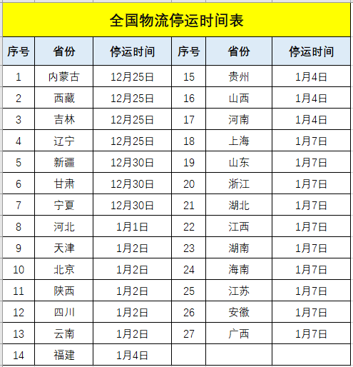 由于天氣寒冷以及霧霾天氣嚴重,今年全國物流停運時間比往年來得早?;趪医煌ú?、物流部等部門發(fā)出的通知,距離物流停運時間不多了,部分區(qū)域物流將于1月5日開始陸續(xù)放假停運,1月18日將全國大范圍停運。