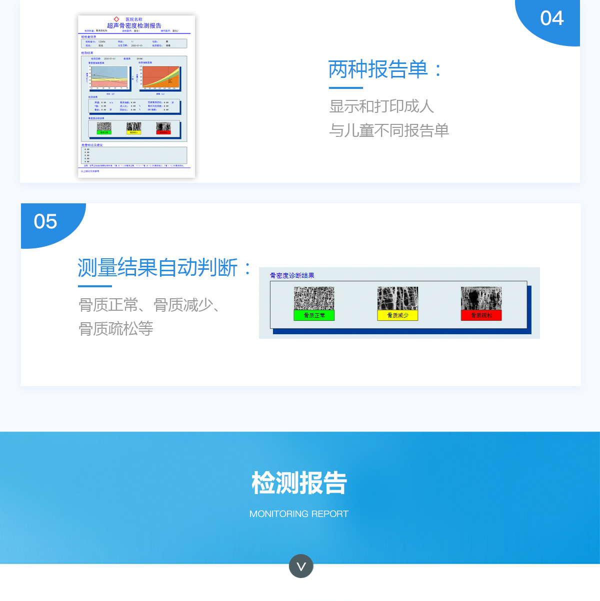 ■ 軟件優(yōu)勢::BMD-A系列超聲骨密度檢測儀一臺儀器裝配有智能分析系統(tǒng),經(jīng)濟實用。可測量0-100歲人群。