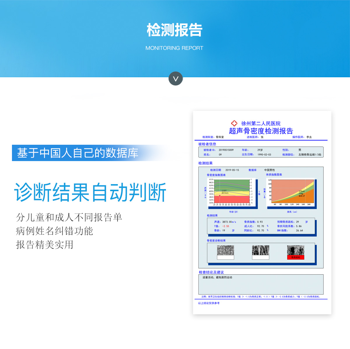 ■ 軟件優(yōu)勢::BMD-A系列超聲骨密度檢測儀一臺儀器裝配有智能分析系統(tǒng),經(jīng)濟(jì)實用。