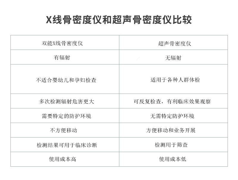 ■ 目前用于臨床的骨密度測量儀器有兩大類,即雙能X線和超聲骨密度測試,雙能X線骨密度儀是行業(yè)檢測標(biāo)準(zhǔn),準(zhǔn)確度高,但從安全性方面超聲骨密度儀有明顯優(yōu)勢,這對人們?nèi)找婷舾械妮椛浔Wo非常重要,比較如下。